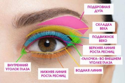 В первую очередь обратите внимание на то, что условно можно разделить глаз, веки и подбровное пространство на зоны – как это сделать, показано на рисунке. Для каждой зоны есть свои рекомендации, которые мы сейчас и рассмотрим