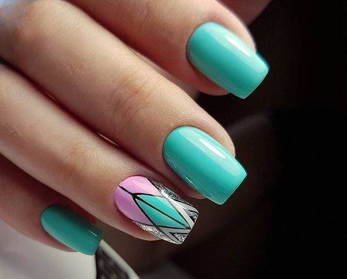 - изумрудный цвет — оригинально и благородно смотрится на коротких квадратных ногтях глубокий насыщенный. Лучше всего маникюр делать в его оттенках стоит в осеннее-зимний сезон, а если его дополнить более светлыми оттенками и цветочным узорам подойдет для весеннее-летнего периода. Особенно роскошно и эффектно смотрится маникюр в технике «кошачий глаз». Игра света на ногтях создает интересные красивые переливы, подчеркивающие форму ногтей.