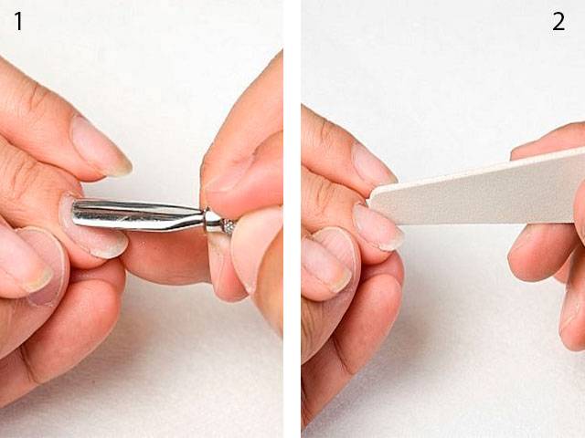 - Начальный этап – этап подготовки ногтя: устранение кутикулы, придание формы, полировка и устранение кожных жиров.