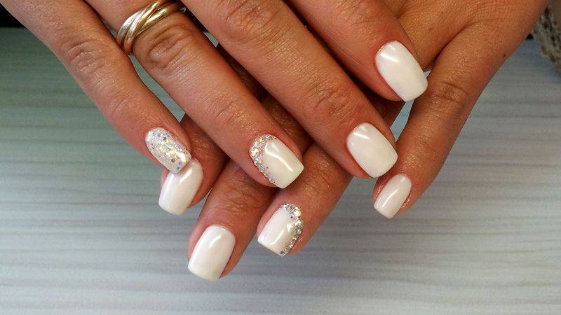 Маникюр со стразами и дополненный блестками идеально подойдет к элегантному вечернему платью и к прекрасному образу невесты, придавая изысканности и сияния.