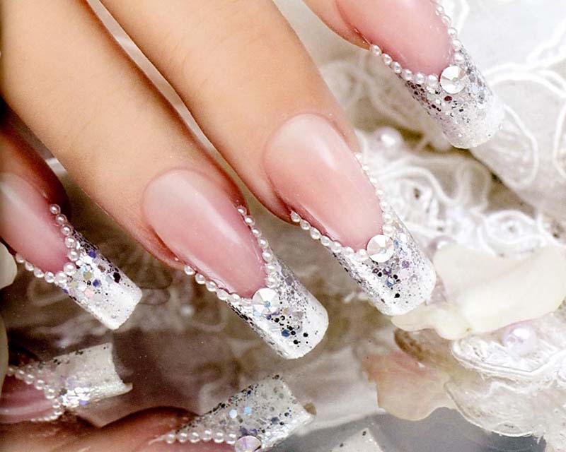Среди направлений для свадебного дня рассматривают оформление в стиле миллениум, где френч выполняется с применением хрустальной крошки. Мерцающие частички буквально растворяются в покрытии, создавая легкое сияние на красивой улыбке.