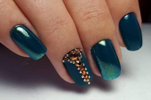 На однотонных ногтях будут великолепно смотреться стразы и блёстки, особенно если гель-лак матовый. Выделить таким образом можно как отдельные ногти, как и каждый из них.