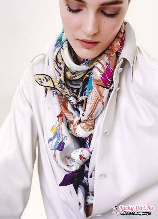 Выбранный узел будет зависеть также от формы самого платка. Максимальное количество вариаций можно найти именно с изделием квадратной формы. Например, его можно повязать не только вокруг шеи, но также захватив грудь и талию. В этом случае платок станет значимой частью образа и позволит обновить привычные блузки, рубашки, футболки.