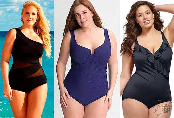 Излюбленной моделью пышек является сплошной купальник, максимально закрывающий тело. В такой модели можно выгодно подчеркнуть красоту женского тела и спрятать некоторые ее изъяны. Модельеры решили компенсировать полноту с помощью сложного кроя из тканей двух цветов, одним из которых всегда был черный. Эффект стройности стал возможным в слитных моделях с помощью горизонтальной драпировки в зоне живота и прямоугольных вставок из ткани черного цвета на боках.