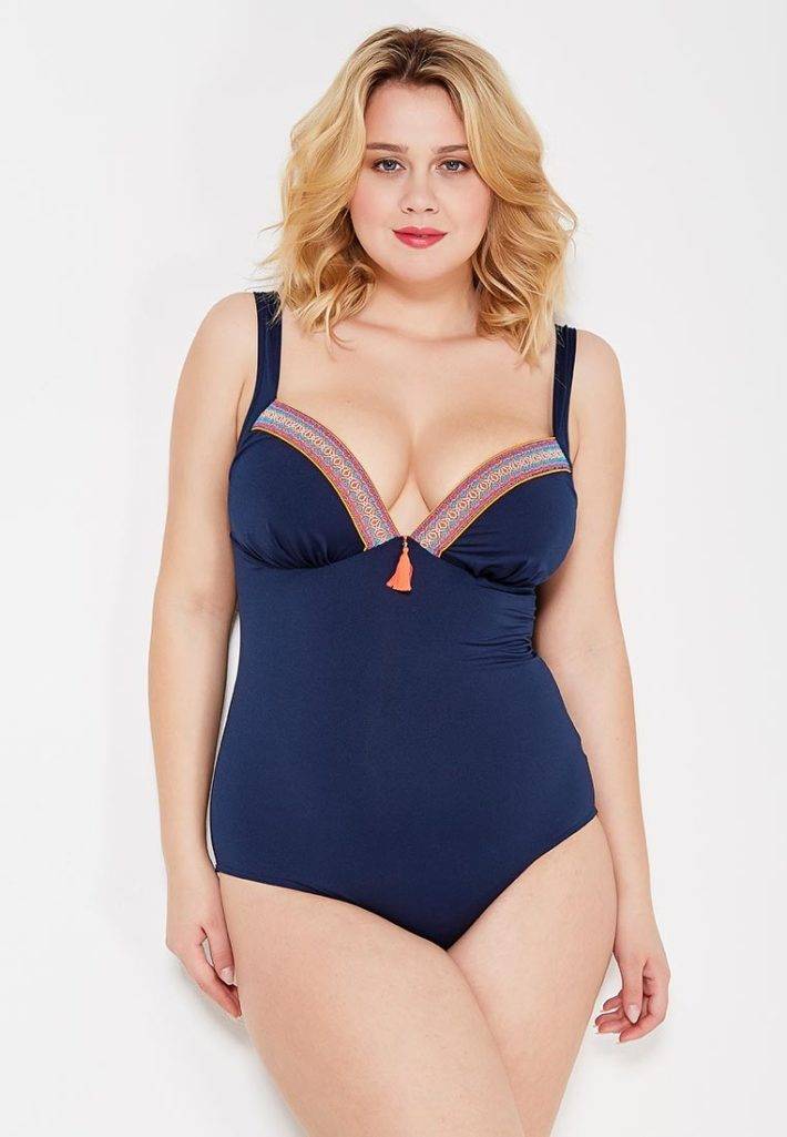 По той причине, что пышки одарены грудью большого размера, фасон бюстгальтера купальника смоделирован с внушительной плотной чашкой, которая закрывает проблемные места в области подмышек и в нижней части изделия.