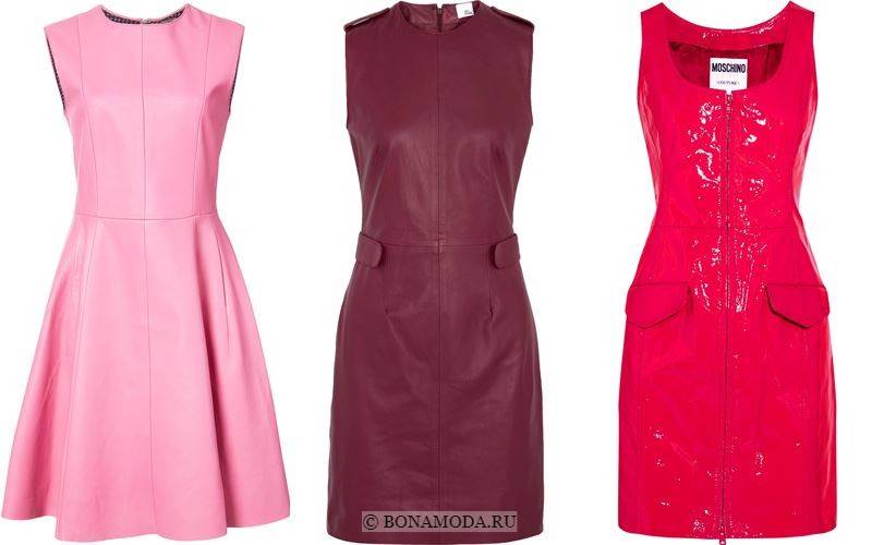 Чем темнее кожаный материал, тем более дерзко и агрессивно смотрится платье. если вы выберете модель из чёрной, бордовой, тёмно-синей, а также красной кожи или платье из розовой, голубой, оранжевой, белой или бежевой кожи одного и того же кроя, то в первом случае вы создадите образ кардинально отличный от второго. Выбирая короткое кожаное платье, всегда учитываете любые мелочи, смотрите на сочетание цветовой гаммы, особенности дизайна и декора, степень облегания. При необходимости уравновешивайте свой стиль безопасными аксессуарами предметами гардероба, выбирая не тонкие шпильки, а стильные кеды или лоферы, не кожаную куртку, а уютный трикотажный кардиган.