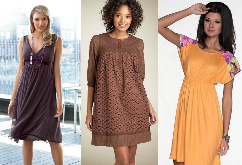 Подходящим считается платье А-силуэта, платье–трапеция зрительно стройнит, снимая акцент с талии. Абсолютно исключите из гардероба облегающую одежду. Что касается принта, то учитывайте, что линейный принт и вертикальные полосы визуально вытянут фигуру.