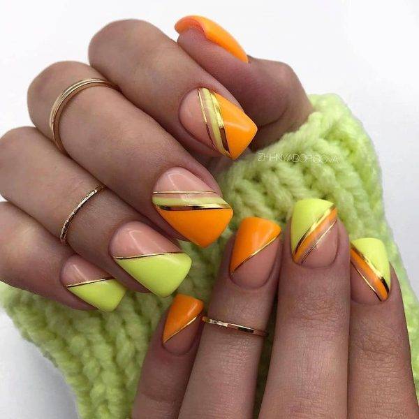 Контрастные и яркие сочетания тонов маникюра с полосками помогут сделать пестрый и броский «color block», что привлечет внимание к вашим пальчикам и уж точно не оставит никого беспристрастным. Прекрасен такой маникюр с линиями для ярких и неотразимых летних образов