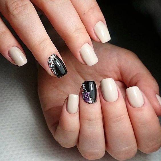 Черный маникюр наиболее удачно сочетается с белым и красным цветом, а стразы следует выбирать из оттенков серебра, золота, зеленого, розового или красного. Чтобы дизайн смотрелся гармонично, рекомендуется украшать 1-2 пальца.