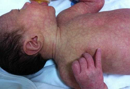 При повышении температуры тела младенца более 38,1°С развивается гипертермия, вызывающий спазм сосудов. Кожные покровы больного приобретают синюшный оттенок, сосуды сильно просвечивают через кожу. Это состояние кожи сопровождается похолоданием рук и ног. После нормализации температуры тела окрас кожи приходит в норму.