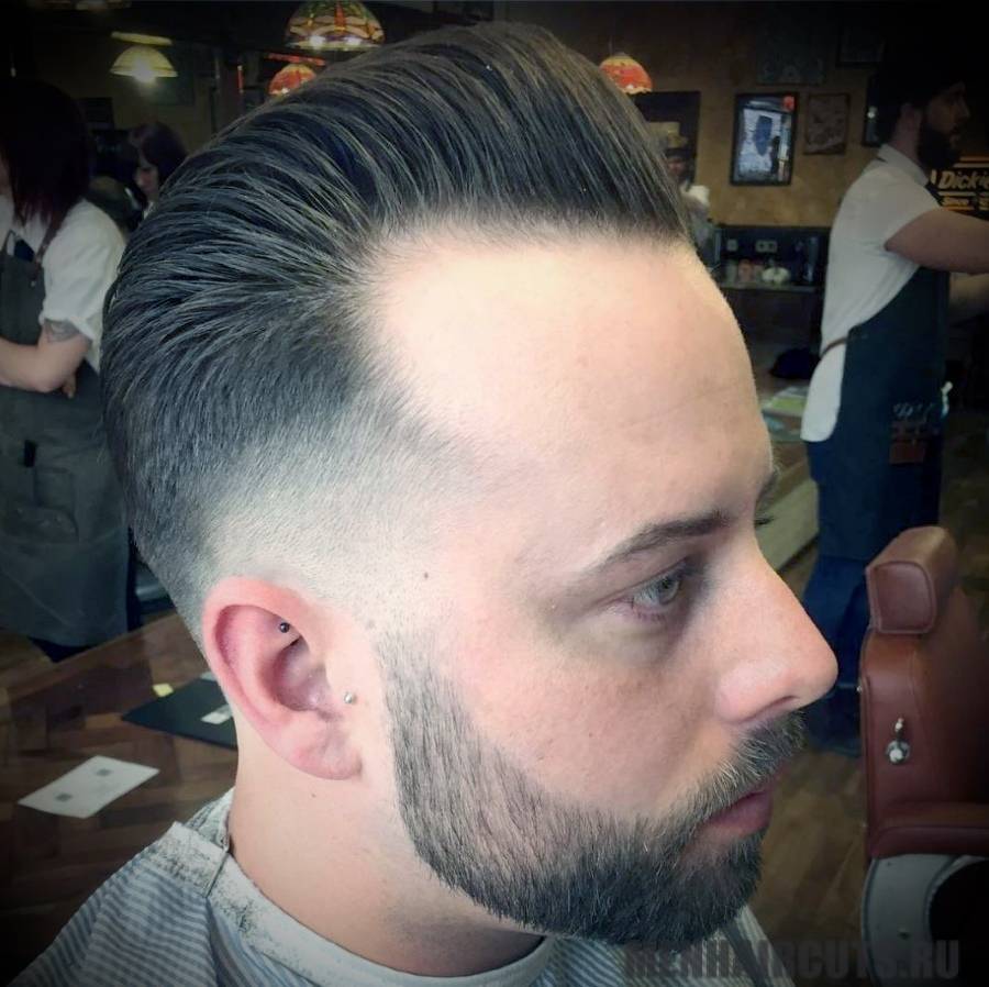 Прическа пришла из Англии и прочно вошла в жизнь. Тренд сезона. Виски и затылок гладко выбриваются, но длина челки сохраняется, что скрывает залысины на лбу. Челку укладывают ото лба к макушке. В этом случае удачно смотрится использование мелирования или прокрашивание волос наверху в светлый оттенок. Светлая прядь замаскирует недостатки.