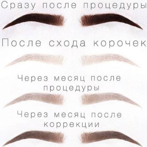 - пройдет некоторое время и на бровях образуются корочки. Самостоятельно избавиться от них нельзя, так как можно нарушить структуру рисунка и спровоцировать воспалительный процесс.