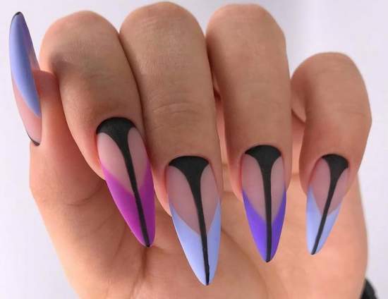 Геометрический дизайн не уступает в популярности другим новомодным видам маникюра, и этот тренд не мог не коснутся френча. Очень востребован стал треугольный френч, который подходит как для ногтей прямоугольной формы, так и для формы ногтей миндаль или треугольник. Треугольный френч можно дополнить небольшими орнаментами, полосками, рисунком оригами или чем-то еще из соответствующей тематики.