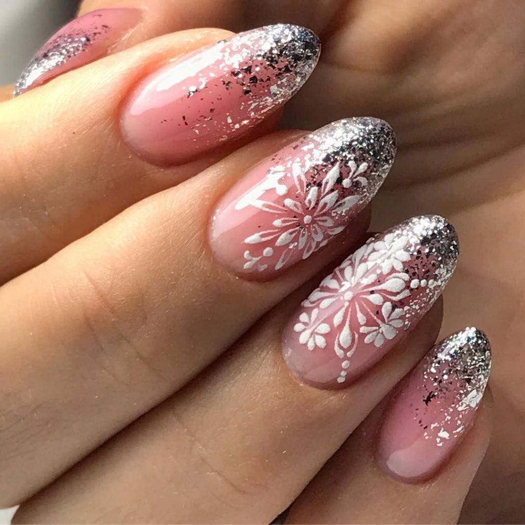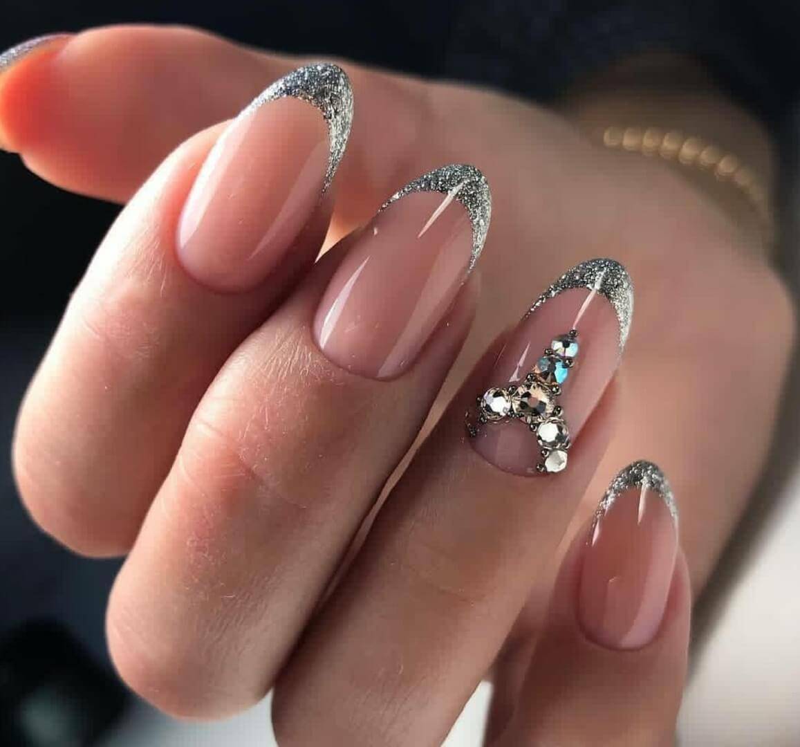 Также многие нейл-мастера используют блестки только в качестве акцента, а именно украшают ими рисунки. То есть изначально французский маникюр сочетают с вензелями, геометрическим дизайном, кружевными вставками и т.д. Когда все готово дизайн можно подчеркнуть блестками с помощью нанесения сухой кистью. В результате получается роскошный объемный маникюр с мерцающими деталями. Подходит он для любого случая, поэтому в 2020 году он особенно актуальный.