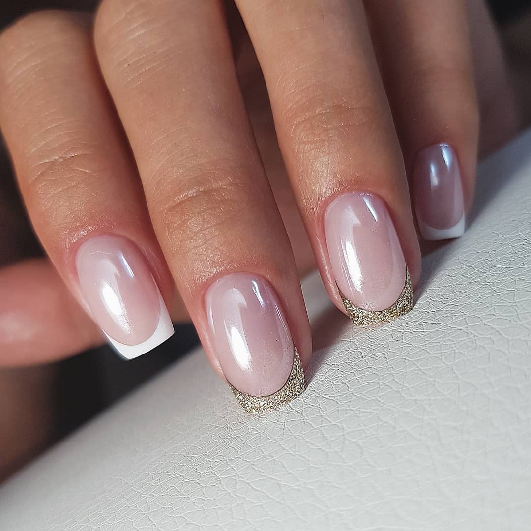 Что касается оформления блестками, то в данном случае лучше использовать их только в качестве акцента. То есть в небольшом количестве на линии улыбки, лунках или же в качестве дизайна. Благодаря такому подходу маникюр не будет перегруженным деталями.