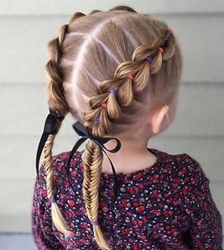 Красиво смотрится, если комбинировать разные косички. Симпатично также выглядит прическа, когда косы переходят в пучки или бантики, не лишним будет и использование ярких ленточек. Мамы здесь уже должны уметь быстро заплести волосы ребенку, так как маленькие дети непоседливы.
