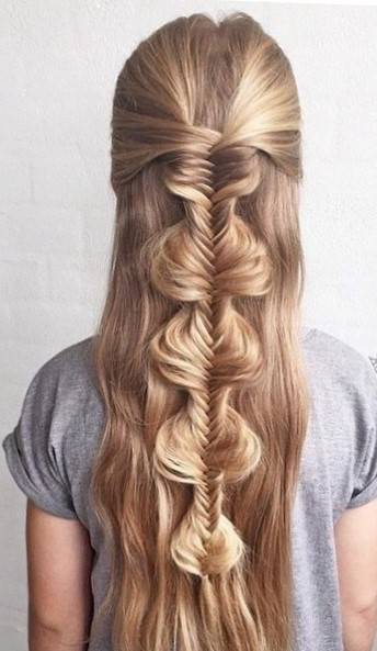 - после того, как Вы собрали все волосы в одном месте, можно приступать к плетению “Рыбий хвост”. Для этого волосы делятся на две равные части. Тонкие пряди перекладываются по очереди из правой части в левую, из левой в правую. Брать пряди необходимо из под низа, перенося их вокруг основной пряди, из которой ее брали;