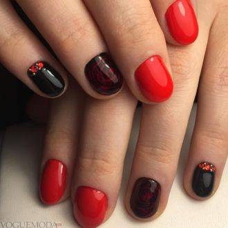 Если за основу взят красный, то белый и чёрный дополняют его незначительными включениями. При этом чёрным часто оформляют линию улыбки или лунки. Белый добавляют в виде матовых страз.