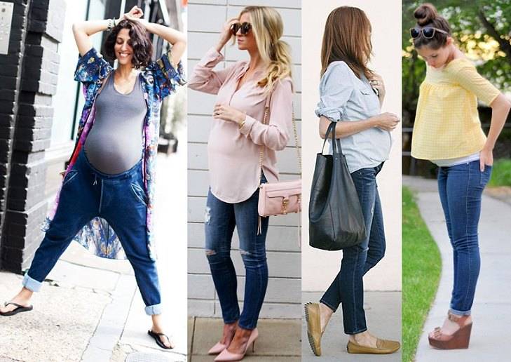 Джинсы для беременных одинаково хорошо выглядят как в сочетании с топами и майками, так и свитерами и пуловерами. В неофициальном месте очень уместны будут джинсы в сочетании с цветными рубашками, надетыми навыпуск. На ноги можно надеть кроссовки, сапоги, туфли или ботфорты. Верхняя одежда тоже может быть самой разной. Куртки, накидки, пальто, пончо – выбор зависит только от стиля беременной женщины.
