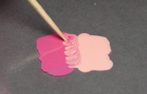 - Далее на картон или фольгу следует нанести 2 и более желаемых оттенка цветного лака. Границы можно сгладить зубочисткой, как на фото: