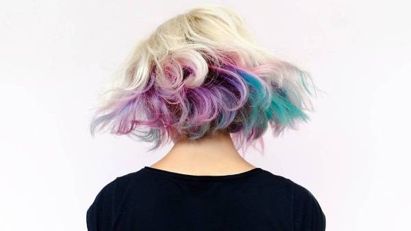 - Цветные кончики − переход от базового блонда к махагону, голубому, сиреневому, красному, розовому.