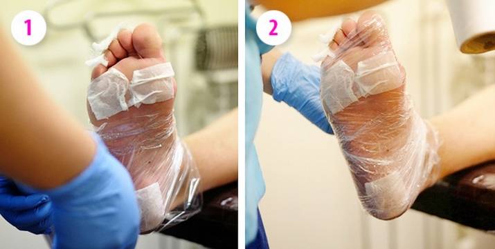 Обработав все огрубевшие участки стоп, нужно укутать ножки целлофановыми пакетиками. Данный состав нужно оставить на ногах на определённое время. Точное время производители обычно указывают на упаковке, обычно это 10-15 минут. По истечении этого времени верхние слои кожи размягчаются и отслаиваются.