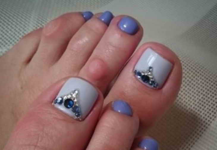 Выберите камни разных размеров и двух цветов: розовый и белый, и чередуйте их, украшая свои ножки. На большом пальце у основания ногтя можно приклеить камни в три ряда, а на остальных – в один. Такой дизайн сногсшибательно будет выглядеть в теплых краях на берегу моря.