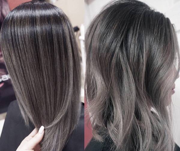 - Графитово-пепельное мелирование. Отлично смотрится на темных локонах. Выделяет кожу и овал лица.