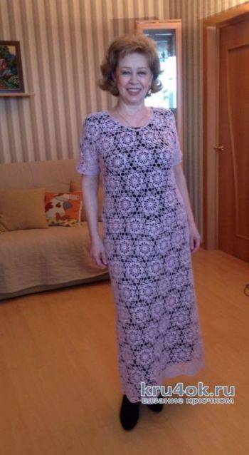 Работа Людмилы Петровой. Летнее платье было связано на юбилей-50-летие. Пряжа «Нарцисс» Кировский (395м\100 гр) — 550 гр кр. 1,5. Где-то прочитала, что мотив называется «королевский квадрат» — он, и правда, очень красивый, элегантный. Разновидностей этого мотива много, можно