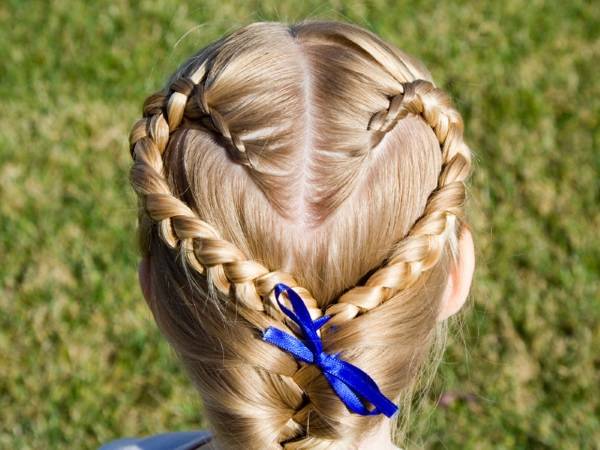 Для такой прически необходимо выделить прядь волос со лба вокруг головы, далее плетем плотную косичку на рогатке наряду с французской. Необходимо разделить хвост на 4 части. Переплетать следует третью прядь и вторую. Как сплести? Поначалу вам может показаться данный процесс достаточно сложным, но со временем вы набьете руку и за считаные минуты сможете выстроить прическу вашей дочке. Видеоурок можно найти бесплатно от Ольги в парикмахерской онлайн.