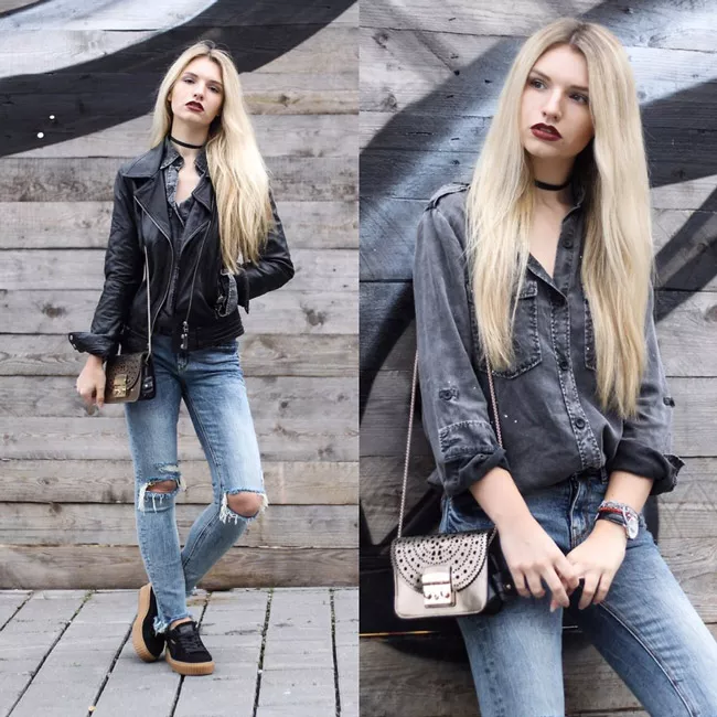 Данный лук подходит для ежедневного костюма представителей творческих профессий, работающих в сфере дизайна, моды и стиля, туризма и современного искусства. Студенты художественных и театральных вузов могут позволить себе джинсы с разрезами и потертостями, подчеркивающие элитарность представителей мира искусства.