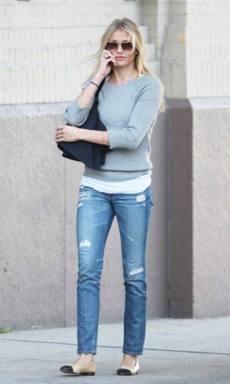 Здесь выполняется основная функция каблуков — удлинение линии ног. Для бойфрендов также можно посоветовать каблуки, причём самой разной ширины, включая шпильки.