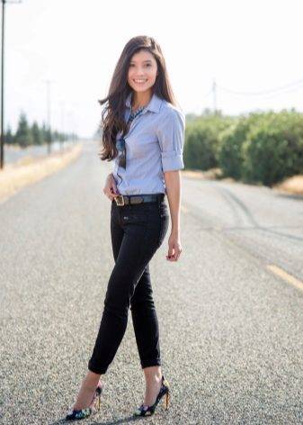 Следует помнить, что короткие варианты визуально скрадывают рост женщины, поэтому низкорослым следует выбирать длинные джинсы. В крайнем случае, можно сочетать желаемую длину с обувью на высоком каблуке.
