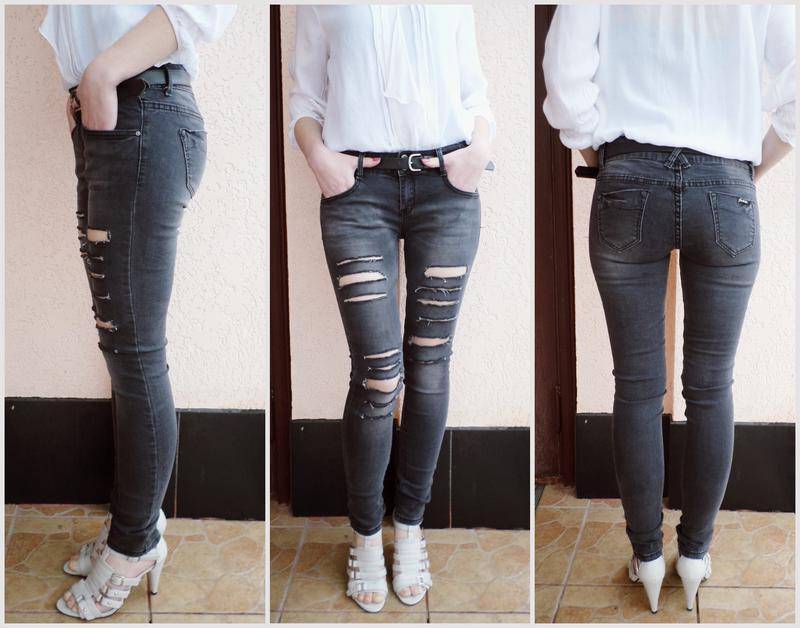 Стального оттенка джинсовые брюки с дырками можно сочетать с любыми вещами. Такие джинсы очень практичны: нарядно выглядят, быстро не загрязняются, гармонируют со всеми цветами. Светлые оттенки серого подойдут худеньким девушкам, темные тона стройнят фигуру, их могут носить полные дамы.
