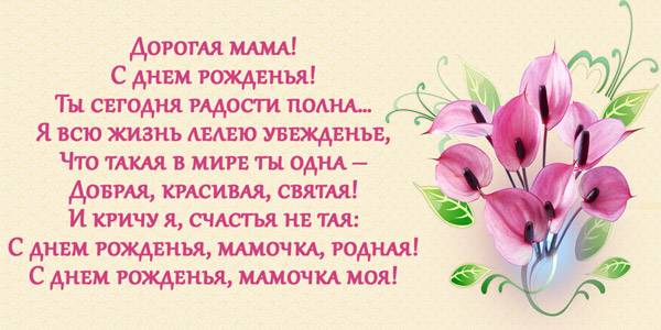 С днем рождения, дорогая мама! Будь счастлива любимая моя. Чтоб каждый день твой был наполнен светом и теплом. И чтоб заботы счастью не мешали, а только силы придавали. Будь веселее день ты ото дня, а завтра чтобы было лучше чем сегодня. Пусть каждый день наполнится добром, ну а родные чтоб не забывали. И в гости приходили, и радость приносили. Люби родимая, и будь любима. Цвети и пахни как цветок. И пусть так будет навсегда. Ты так красива и неповторима. Любимая ты мамочка моя.