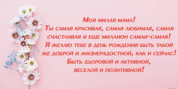 Мама, родная, красивая, дорогая, ласковая, нежная, с днем рождения! Хочу пожелать, чтобы твое сердце — неиссякаемый источник чудес — было всегда наполнено радостью, а улыбка — самая искренняя и добрая — согревала душу. Пусть Господь хранит от бед, тоска и печаль не беспокоят, а день приносит истину, гармонию, мир, подобно твоим словам. Пусть солнце над твоей головой светит так ярко, как ты для меня. Моя неутомимая, заботливая, нужная, благодаря тебе владею даром жизни. Спасибо! Будь сильной, очаровательной, полной энтузиазма. Миллиард цветов к твоим ногам. Люблю тебя, мамочка!