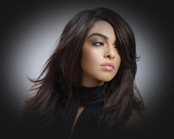 - Что касается челки, то она не должна быть ровной и короткой, выбирайте челки средней длины или длинные, лучше филированные и зачесанные на бок, таким образом челка будет сглаживать довольно строгие четкие черты лица