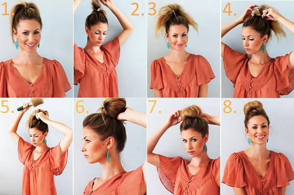 - Создать с помощью бублика пучок. Сбрызнуть лаком.