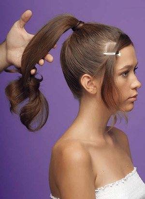 - Разделите хвост на две части. Одну части закрутите наподобие ракушки и закрепите невидимками. Оставшуюся часть обмотайте вокруг основания хвоста, чтобы не было видно резинку.