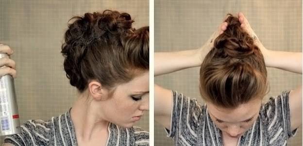 -теперь всю шевелюру необходимо собрать в хвост и скрутить в жгут, при этом формируя их одновременно в шишку;