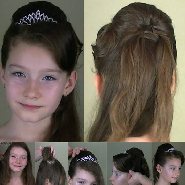 Раньше эта прическа не отличалась разнообразием, но сейчас вариантов пучка очень много и на любой вкус, а если его украсить маленькой диадемой, то ваша дочь будет выглядеть как настоящая принцесса.