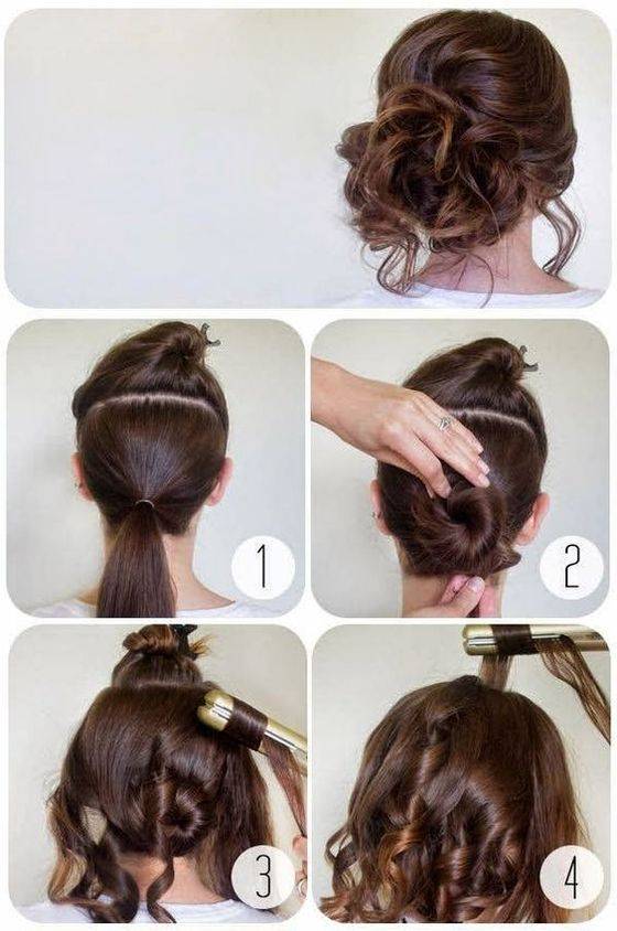 Наверху, на затылке волосы собираются в хвост. После из него создается небольшая петелька, которую следует разделить на две части. Затем кончик хвоста ложится в середину петельки и перекручивается, после чего фиксируется в прическе. Свисающую шевелюру можно накрутить.
