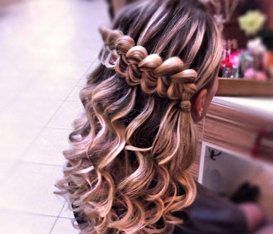 Для начала волосы нужно вымыт и расчесать. Сначала следует начинать плетение с одного из висков. Плетётся французская коса, затем крайняя прядь опускается, а вместо нее берется другая, так следует делать, до противоположной стороны. Опущенные пряди будут водопадом. Оставшуюся прядь можно превратить в косу. Чтобы прическа водопад получилась красивее локоны можно накрутить.