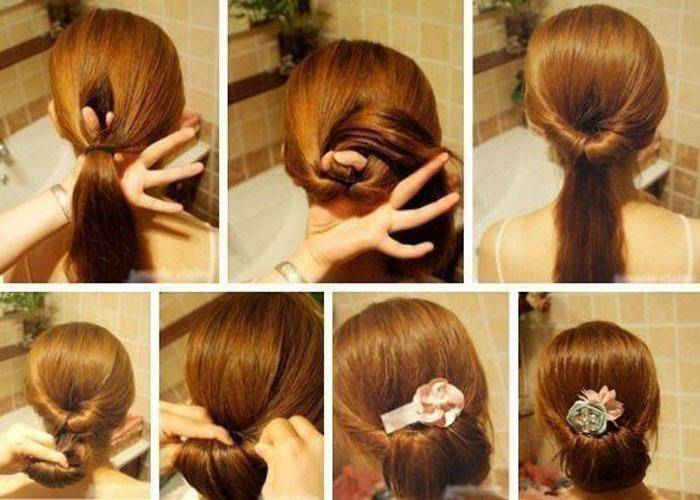 Для этой прически понадобится специальная резинка-«бублик», которая надевается на хвост. Часть волос при этом нужно оставить не продетыми в нее. Волосы распределяются вокруг бублика и закрепляются у его основания. Прядь волос, которая оставалась свободной, заплетается в свободную косичку и оборачивается вокруг пучка.