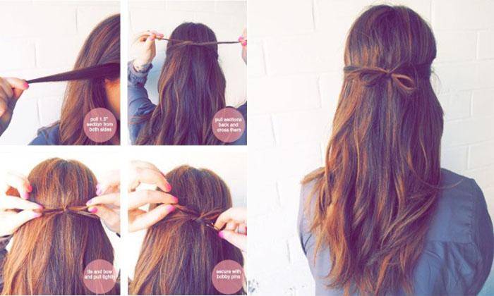 Чтобы сделать такую прическу нужно с обеих стороны головы взять длинные, толстые прядки. Затем скрепить их между собой на затылке, а после перетянуть через нее весь наш хвост несколько раз. А на третий, оставляем часть волос, как указанно на фото. У нас должен получится маленький пучок, который стоит развести в стороны, по типу бантика и закрепить невидимками. А хвостиком нашего хвоста, оборачиваем середину бантика и прическа готова.