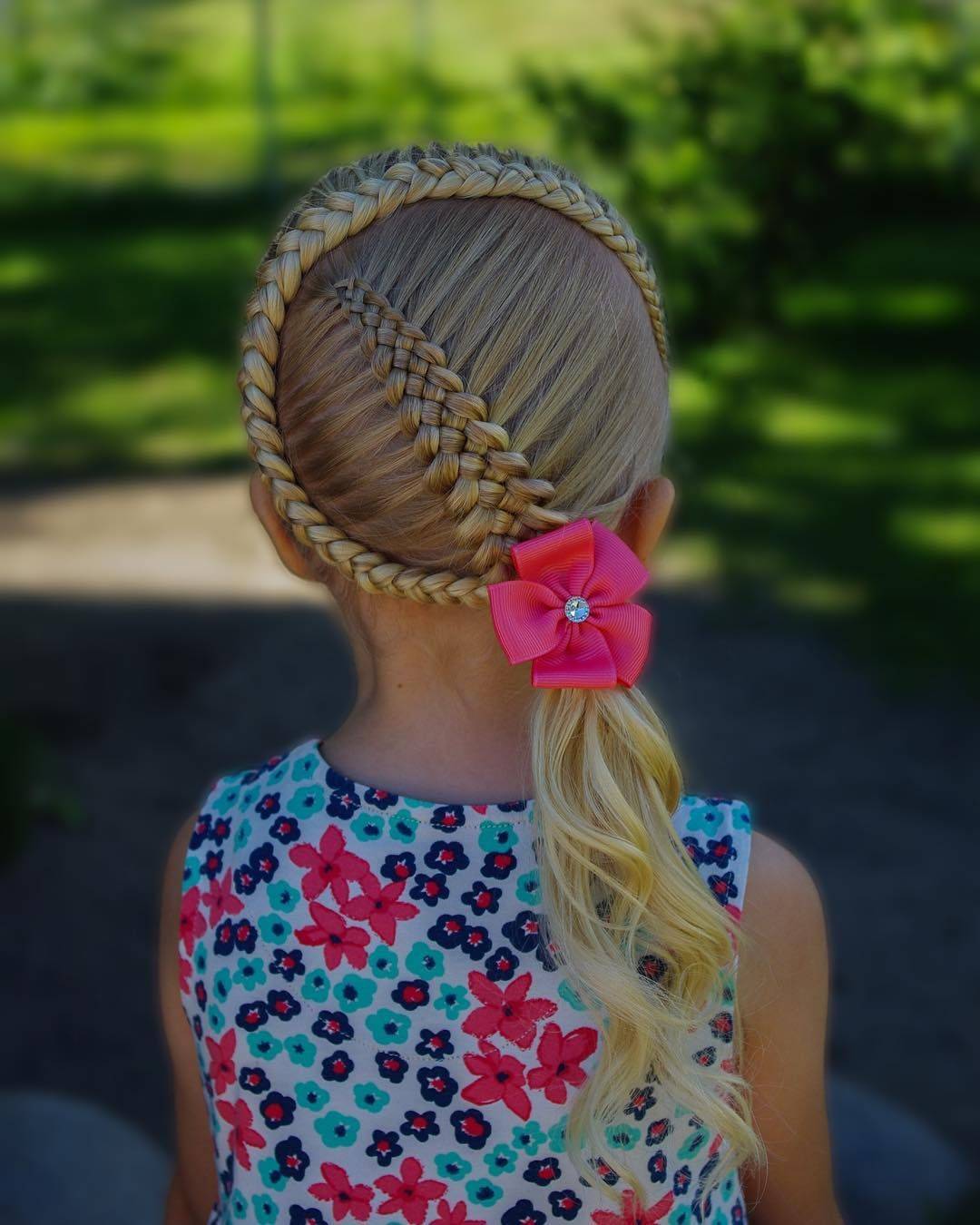 Маленьким девочкам можно облегчить задачу и заплетать косы из хвостов. Так не придётся учиться плести аккуратное основание. Косы располагаются также как хвосты. Множество красивых причесок можно сделать из 2 кос, заплетённых по бокам.