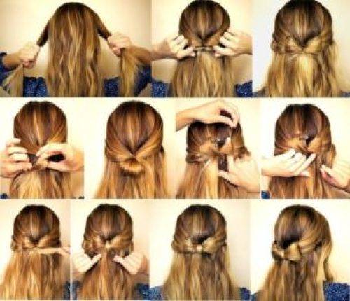 С помощью расчески или рук разделяем волосы на 2 одинаковые части. Получившиеся 2 пряди завязываем простым узлом. Затем оборачиваем каждым свободным концом самодельный узел с одной и с другой стороны. Кончики прячем в прическу с помощью обычных шпилек.