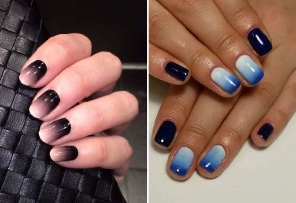 Лучшим является дизайн с эффектом «омбре», при оформлении которого сочетаются цветовые переходы от тёмного начала до полупрозрачного краешка ногтя. Дополнительно наносят блеск.
