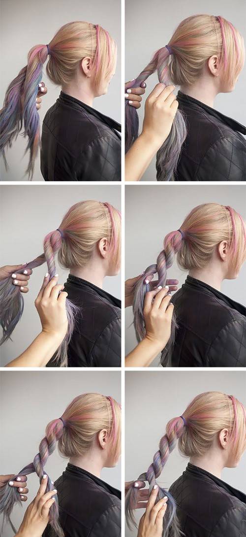 - Разровнять локоны и аккуратно завязать в тугой хвостик, затем закрутить их жгутиком.