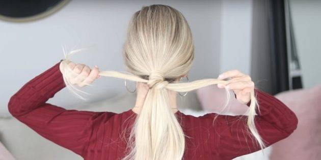 Снова перекрестите прядки за хвостом и завяжите спереди узлом.